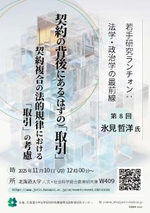 若手研究ランチォン:法学・政治学の最前線【第8回】「契約の背後にある(はずの)『取引』——契約複合の法的規律における『取引』の考慮」 2025年9月29日 最終更新日時 : 2025年9月29日 juris_sub イベント詳細 日付: 2025年11月10日 12:00 PM – 2:00 PM 日時:2025年11月10日(月) 12時00分~ 場所:北海道大学 人文・社会科学総合教育研究棟W409室 報告:氷見 哲洋 氏「契約の背後にある(はずの)『取引』——契約複合の法的規律における『取引』の考慮」 ポスター(PDF) 主催:北海道大学大学院法学研究科附属高等法政教育研究センター